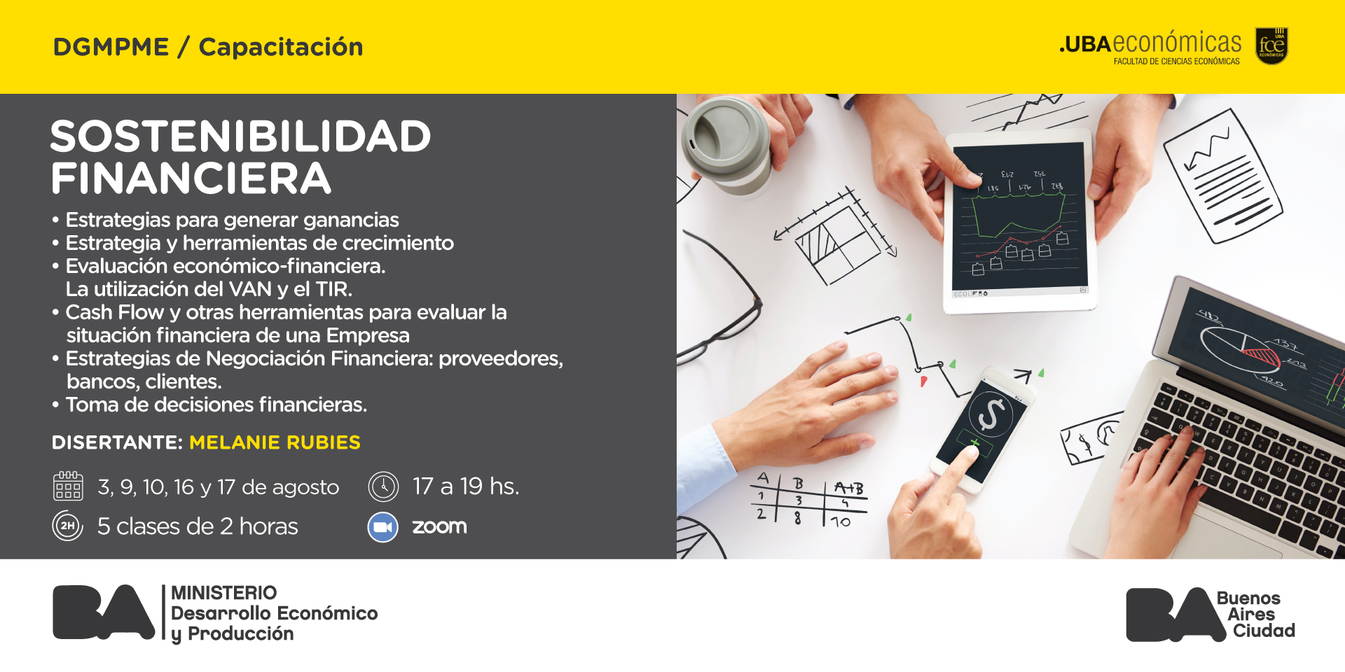 Durante los días 3, 9, 10, 16 y 17 de agosto de 17:00 a 19:00 vía Zoom, se llevará a cabo una importante capacitación acerca de Sostenibilidad Financiera, la disertante será Melanie Rubies.